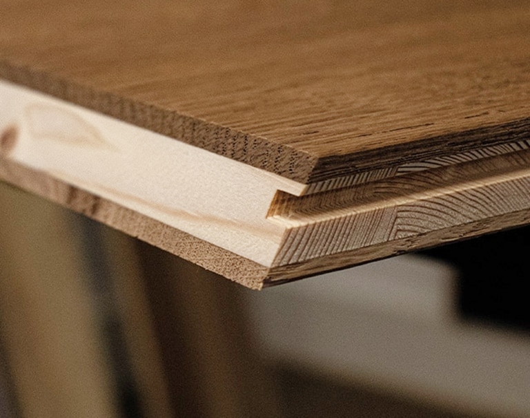 Bei den Brettern, die uns die Welt bedeuten, denken wir gerne großzügig. Alle unserer Holzböden haben einen symmetrischen Aufbau aus 4 mm Deckschicht, 8 mm Mittellage und 4 mm Gegenzug. Bei der Deluxe Maxi Langdiele darf es sogar noch etwas mehr sein: 5 mm Echtholz-Auflage bilden die Deckschicht der edlen Halbmassivdiele, 12 mm Mittellage und 4 mm Gegenzug sorgen für besondere Formstabilität. Ein echtes Naturprodukt durch und durch.